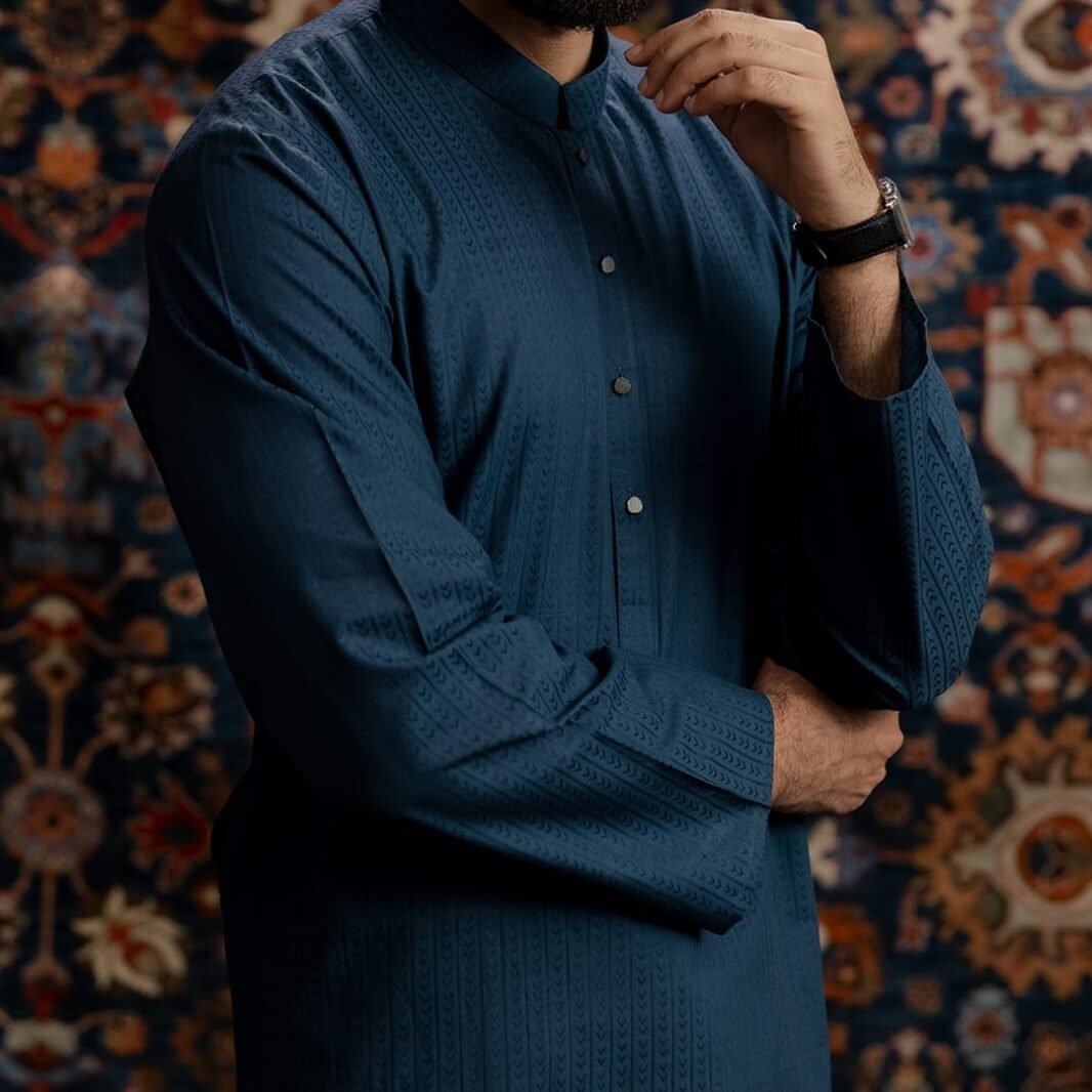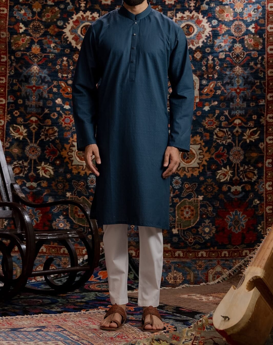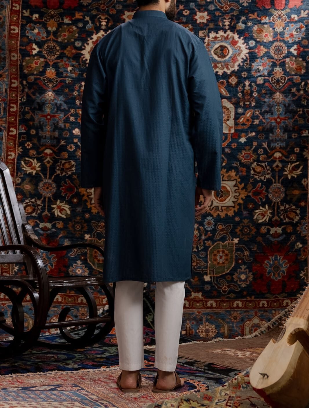 Featuring an intricate self-printed design, this kurta pajama stands out effortlessly. The vibrant blue hue complements all skin tones, making it a versatile addition to your collection.